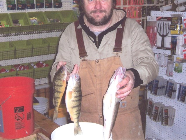 HERE’S A PICTURE OF MARK. G WITH A BUCKET FULL OF SLABS AND THREE NICE WALLEYE FROM LONG LAKE.