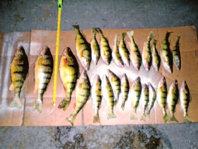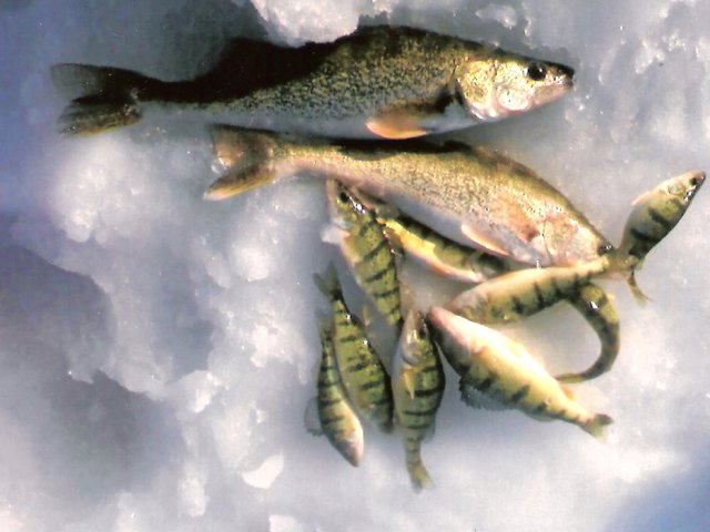 WE ONLY HAVE THREE WEEKS LEFT TO FISH WALLEYE AND PIKE. THEN, MARCH 15, YOU MUST REMOVE YOUR PERMANENT SHANTIES, AND PERCH AND GILLS ARE ABOUT IT FOR FISHING. BUT THE PERCH ARE WELL WORTH THE TRIP. WE HAD PERCH FOR DINNER LAST NIGHT, AND THEY WERE VERY GOOD. MUCH BETTER THAN RESTAURANT OR GROCERY STORE PERCH. RIGHT FROM THE LAKE TO THE FRYING PAN.